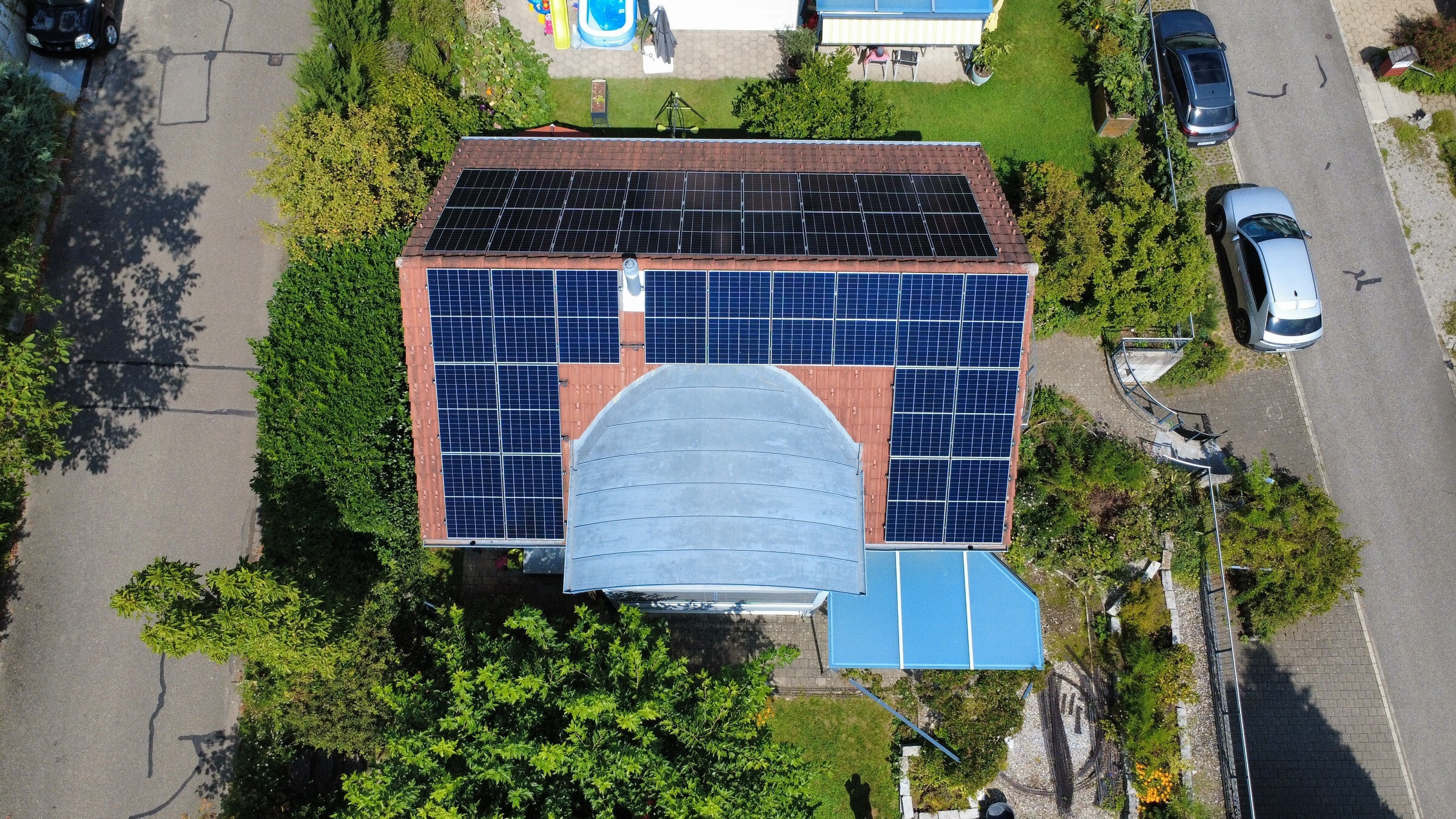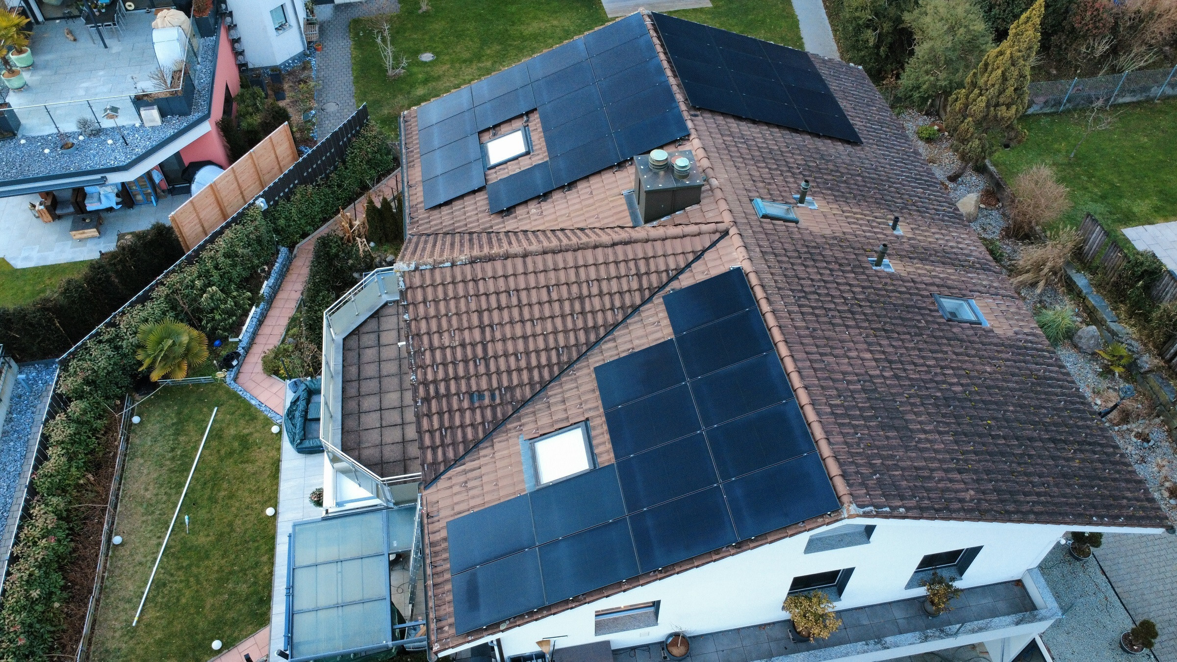 Auf einem Ziegeldach, Süddach, mit diversen Blindmodulen.